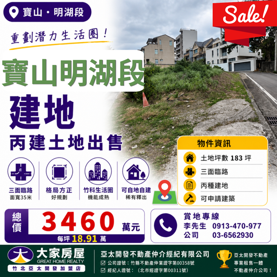 📍 寶山明湖段三面臨路 183 坪丙種建地